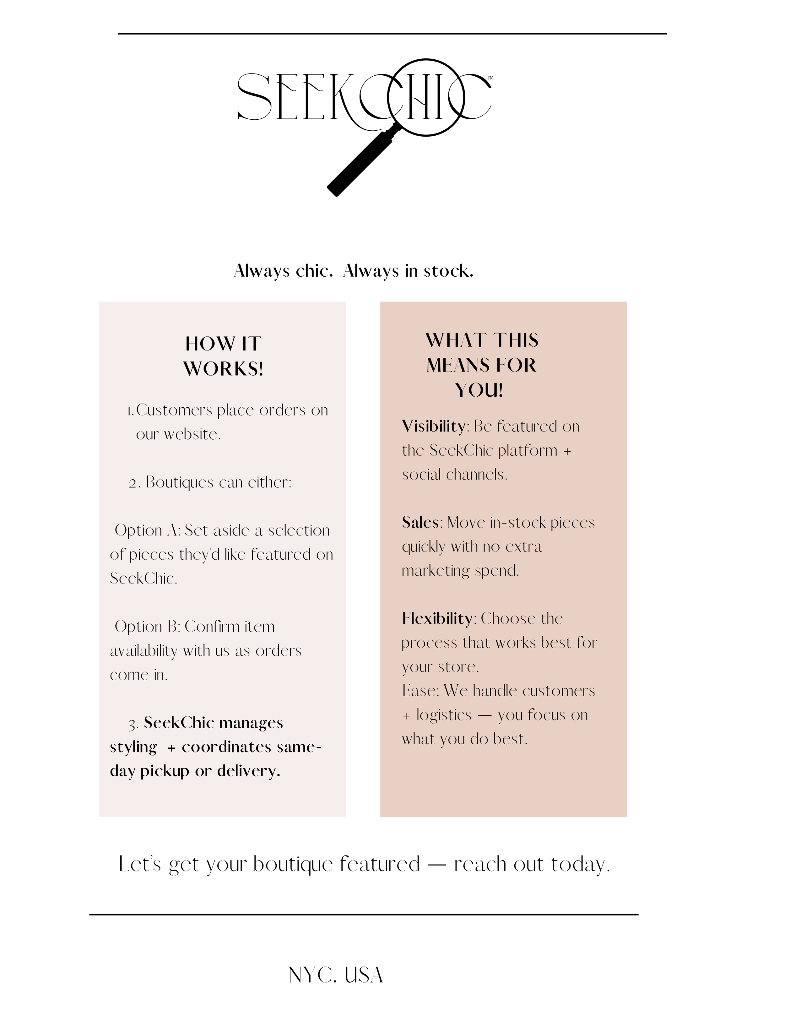 At SeekChic, last-minute never means last-resort. We connect shoppers with local boutiques for same-day style from full looks to statement pieces, instantly. For shoppers: chic finds, ready when you are. For boutiques: visibility + real-time sales from in-stock inventory
